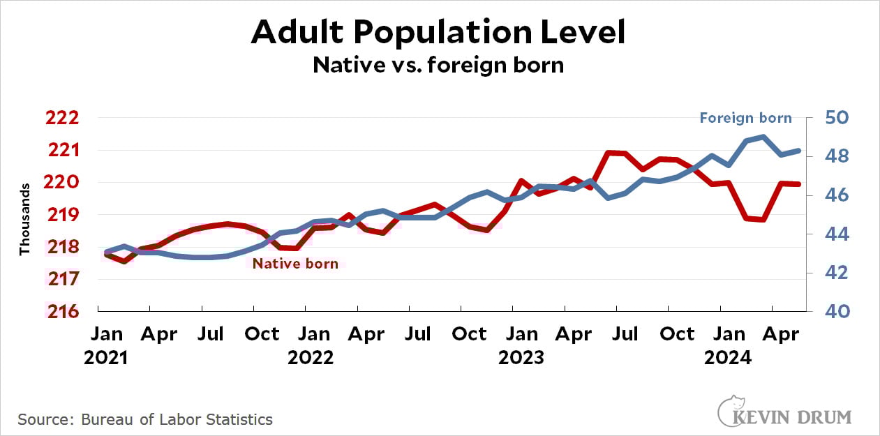 The data shows that native-born workers have added jobs for a consecutive month, with foreign-born individuals increasingly leaving the labor force.